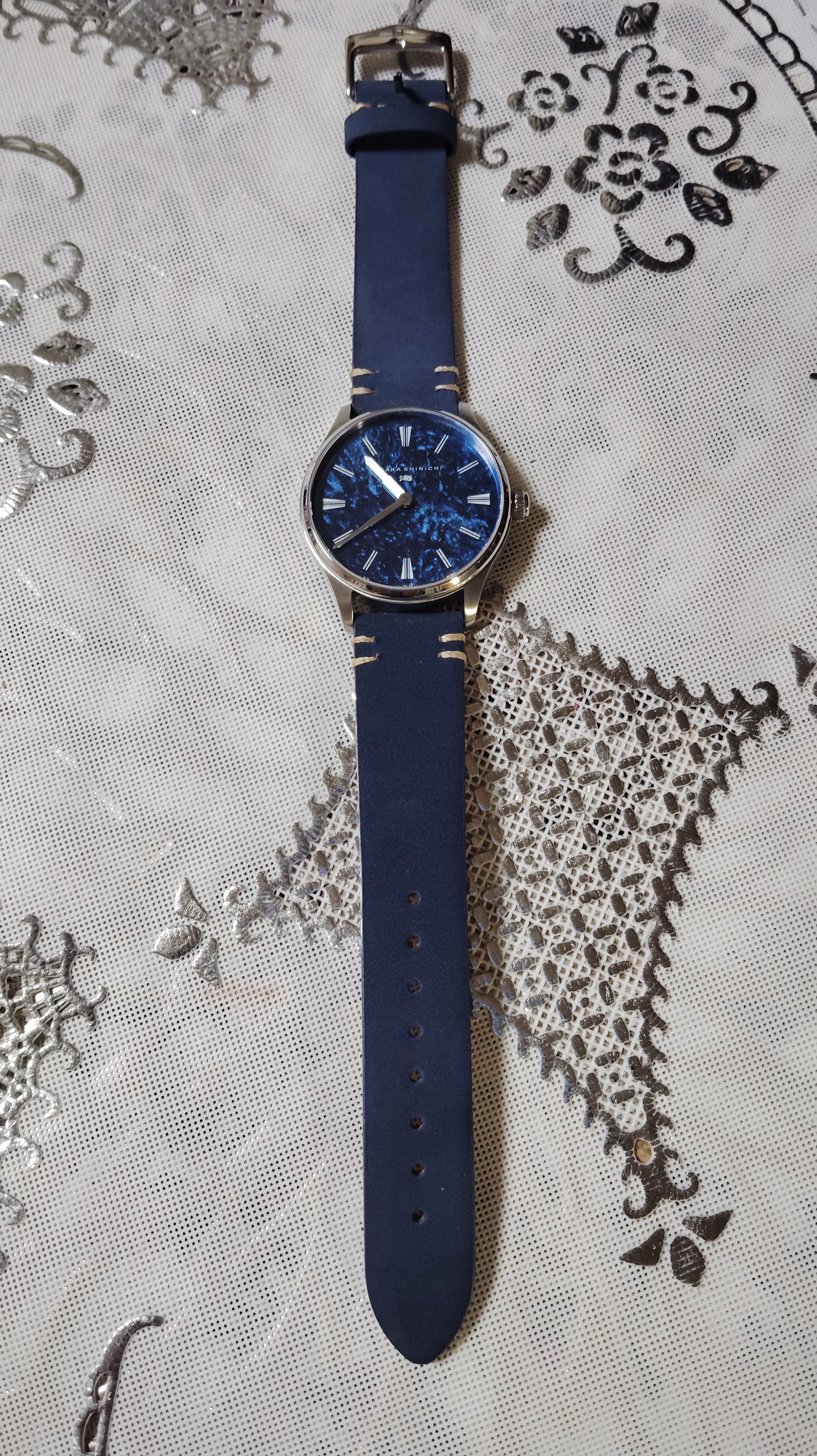 Before working with watches, I did nothing but stroll along Arakawa, gazing at the water's surface. To express that surface on the dial, I crafted the finish from pigments and applied Japanese-made plating.